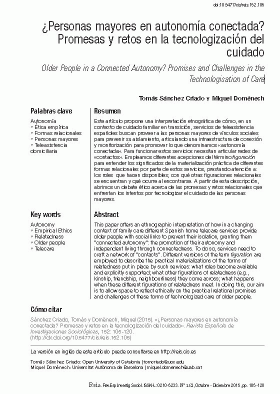 ¿Personas mayores en autonomía conectada? : promesas y retos en la tecnologización del cuidado [Recurs electrònic] / Tomás Sánchez-Criado, Miquel Domènech