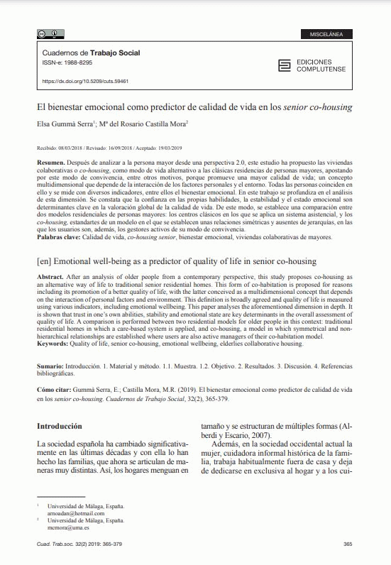 El Bienestar emocional como predictor de calidad de vida en los senior co-housing / Elsa Gummà Serra, María Rosario Castilla Mora [Recurs electrònic]